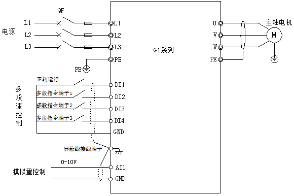 主軸變頻器頻率設定源有兩種:多段速(7段)、模擬量0-10V,實際使用中請用戶根據(jù)控制卡實際提供信號來選擇其中一種接線方式,并設置相對應參數(shù)即可。